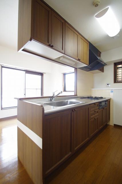 バス・トイレ別、シャワー、洗面所、洗面台、シャワー付洗面化粧台、システムキッチン、カウンターキッチン、3口コンロ、グリル、全居室収納、クローゼット、洗濯機置場、室内洗濯機置場、オートロック、角部屋、都市ガス、上水道、下水道、給湯、エレベーター
