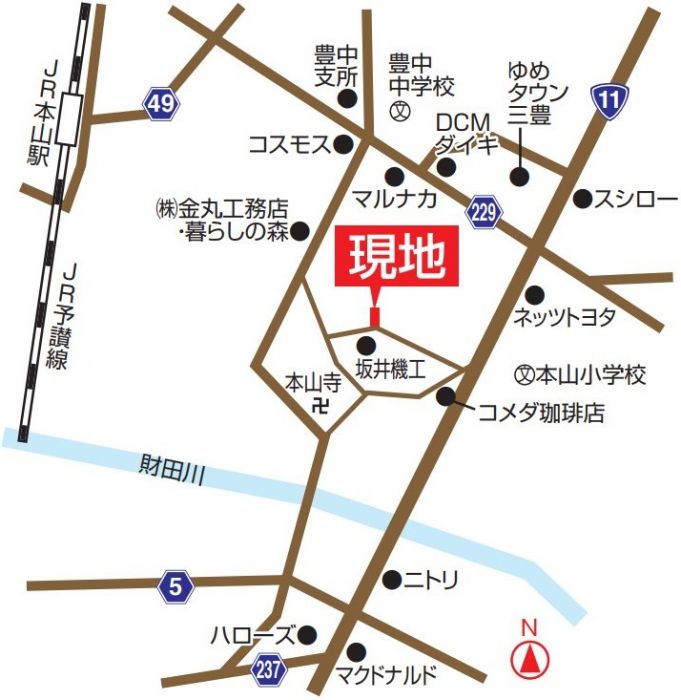 予讃線本山駅 徒歩13分 駅までmap