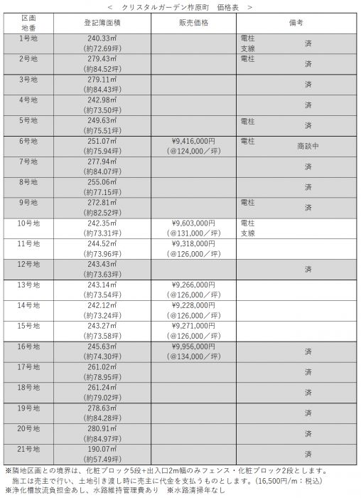 外構・造園協定あり(隣地区画との境界に化粧ブロック5段+出入口2m幅のみフェンス:16,500円/m:税込)