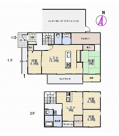 1F:和室8.0、洋室4.6、LDK15.9、WCL 2F:洋室4.5×2、LDK9.0