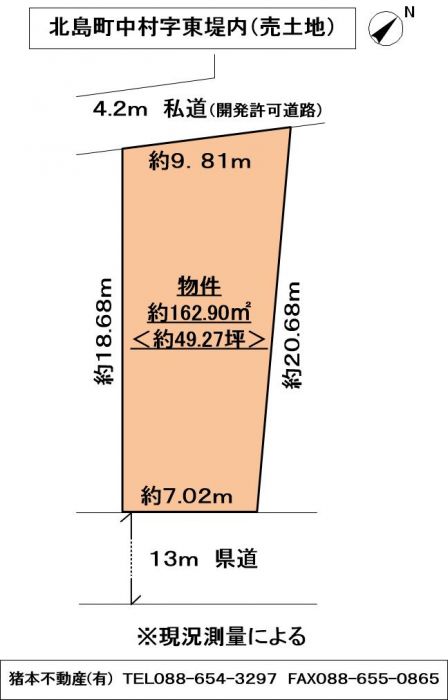 【二方(除角地)】 南 幅:13m 公道 接面:7m 舗装有/北西 幅:4.2m 私道 接面:9.8m 舗装有