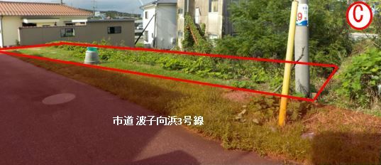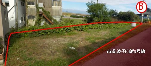 接道:市道波子向浜3号線 上水道:接道埋没Φ50より引込工事要 排水:接道東側側溝へ排水工事要 接道面高と西側高低差約2.5mあり 現状有姿引渡し 波子海水浴場まで180m(徒歩3分) 海水浴・釣り・サーフィン等に絶好地