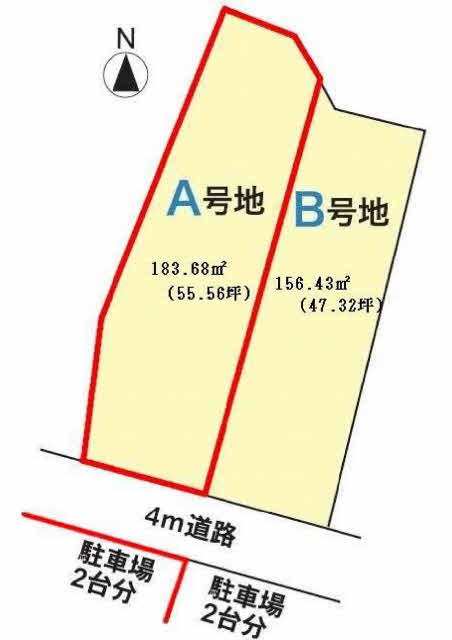 宅地部分183.68㎡(55.56坪)道路南側駐車場用地29.84㎡(9.02坪)2筆になります。フェンス工事・駐車場用地整地してお渡しします。43条許可必要です。