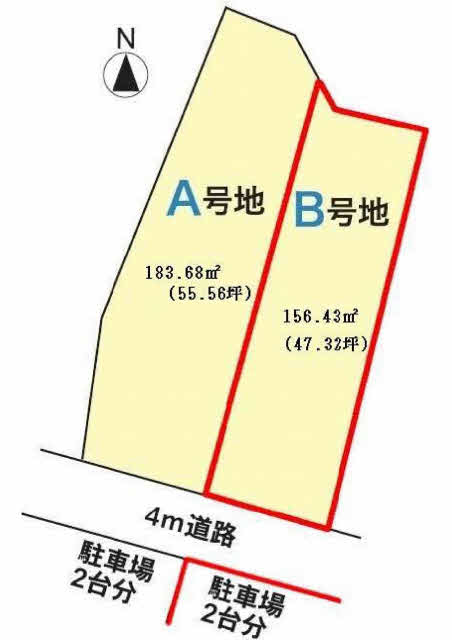 宅地156.43㎡(47.32坪)道路南側駐車場用地20.59㎡(6.22坪)2筆になります。フェンス工事・駐車場用地整地してお渡しします。43条許可必要です。